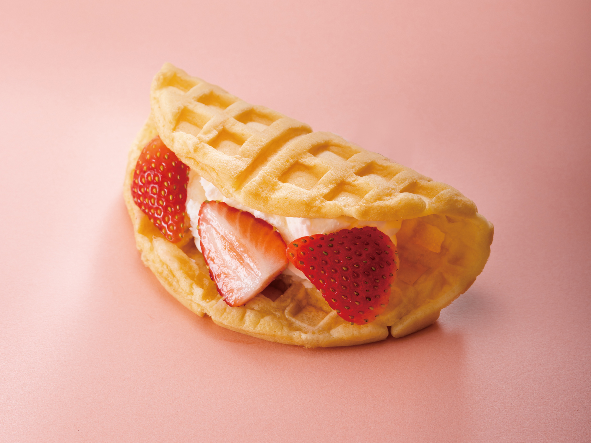 王道カスタード×生クリームに新鮮なもぎたてのいちごを乗せ、ふわっふわしっとりなワッフル生地でサンド。